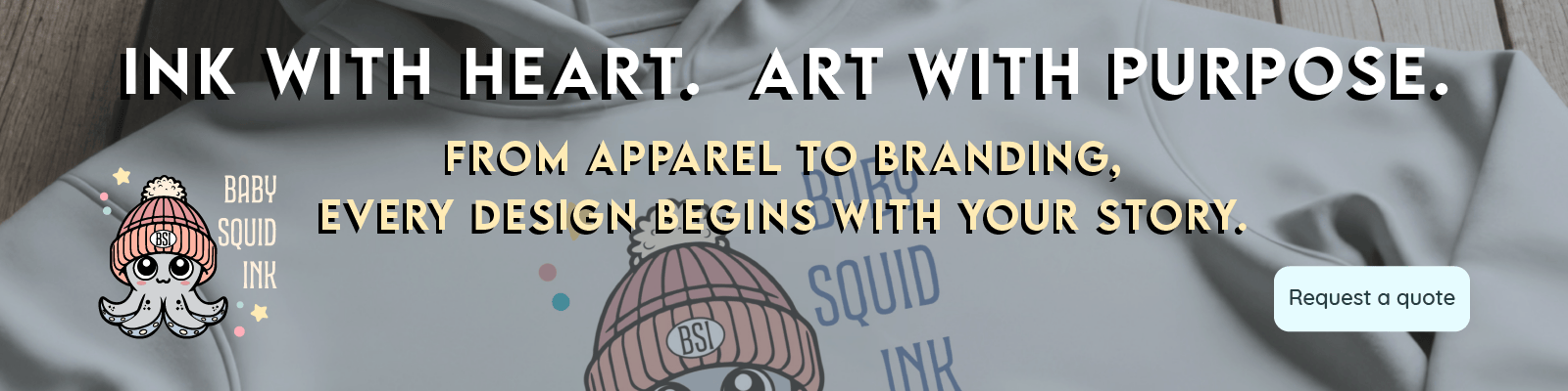 From one-of-a-kind gifts to team gear and event keepsakes, Baby Squid Ink creates personalized pieces that reflect your story. Choose your colors, styles, and message—we’ll help you make something memorable, wearable, and uniquely yours.